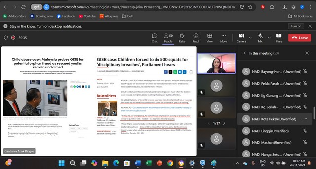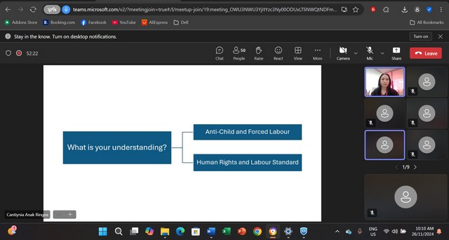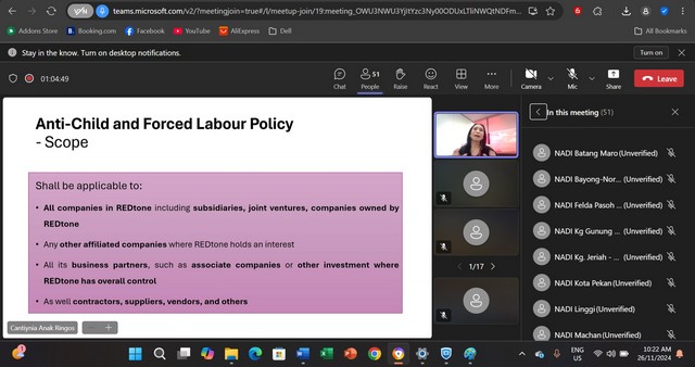 27 November 2024 | Aktiviti TerkiniPada 26 November 2024, telah berlangsungnya Staff Training 2024 bagi Pusat Sebaran Maklumat Nasional (NADI) yang tersenarai secara maya melalui aplikasi Microsoft Team. Pihak Sprintz Designs (SD) telah melantik seorang Trainer yang berpengalaman iaitu Mdm Cantiynia Anak Rigos untuk mengendalikan kursus pada kali ini. Tajuk kursus kali ini adalah Human Rights and Lobour Standards + Anti Child and Forced Labour.