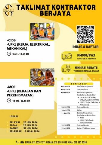 24 Jun 2024 | Aktiviti TerkiniPada 23 Jun 2024, telah berlangsung Taklimat Kontraktor Berjaya di Pusat Sebaran Maklumat Nasional (NADI) Kg Jerijeh. Taklimat ini adalah program kerjasama antara Inkubiz Sentral Sdn Bhd dan NADI Kg Jerijeh dalam memberi taklimat menjurus kepada pendaftaran dan pengemaskinian CIDB, UPKJ dan MOF. Kehadiran adalah seramai 21 orang yang terdiri daripada kontraktor tempatan Daerah Tanjung Manis.