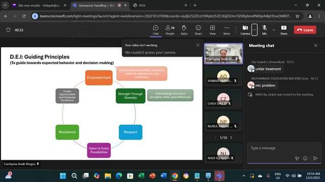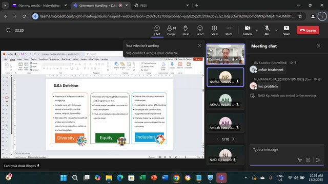 14 Februari 2025 | Aktiviti TerkiniPada 13 Februari 2025, telah berlangsungnya Staff Training 2025 bagi Pusat Sebaran Maklumat Nasional (NADI) yang tersenarai secara maya melalui aplikasi Microsoft Team. Pihak Sprintz Designs (SD) telah melantik seorang Trainer yang berpengalaman iaitu Puan Cantiynia Anak Ringos untuk mengendalikan kursus pada kali ini. Tajuk kursus kali ini adalah Grievance Handling + D.E.I Policy.