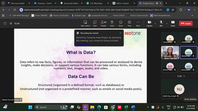 13 Februari 2026 | Aktiviti TerkiniPada 13 Februari 2026, telah berlangsungnya Staff Training 2026 bagi Pusat Sebaran Maklumat Nasional (NADI) yang tersenarai secara maya melalui aplikasi Microsoft Team. Pihak Sprintz Designs (SD) telah melantik seorang Trainer yang berpengalaman iaitu Encik Mohd Azreek Bin Adam untuk mengendalikan kursus pada kali ini. Tajuk kursus kali ini adalah Product Knowledge : Data Protection – Know Your Protection.