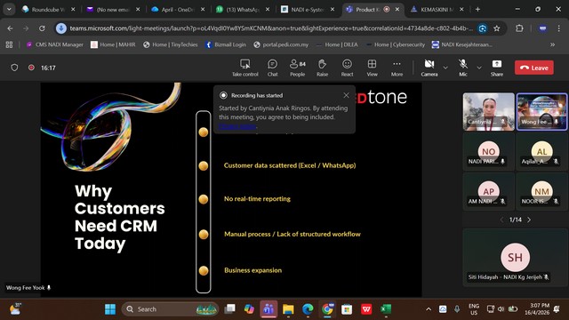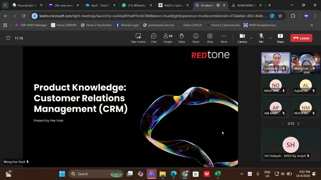 Pada 16 April 2026, telah berlangsungnya Staff Training 2026 bagi Pusat Sebaran Maklumat Nasional (NADI) yang tersenarai secara maya melalui aplikasi Microsoft Team. Pihak Sprintz Designs (SD) telah melantik seorang Trainer yang berpengalaman iaitu Puan Wong Fee Yook untuk mengendalikan kursus pada kali ini. Tajuk kursus kali ini adalah Product Knowledge : Customer Relations Management (CRM).