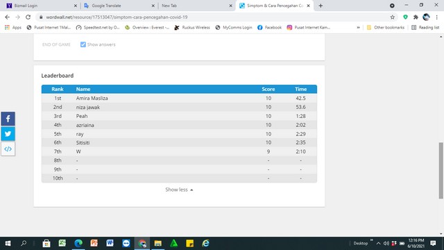 10 Jun 2021 | Aktiviti TerkiniPada 10 Jun 2021, kuiz secara atas talian berbentuk silang kata telah diadakan. Kuiz ini diadakan untuk dihantar kepada komuniti secara atas talian bagi melengkapkan kuiz silang kata tersebut. Kuiz silang kata ini bertajuk Simptom & Cara Pencegahan Covid-19 dan telah disertai seramai 7 orang komuniti.