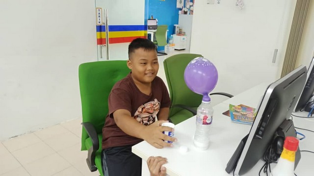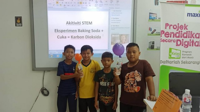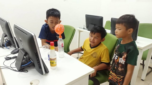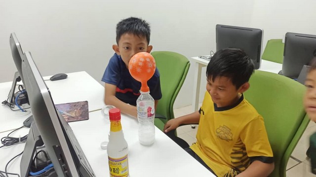 - Peserta disediakan dengan bahan seperti botol, soda bikarbonat, cuka dan balon.