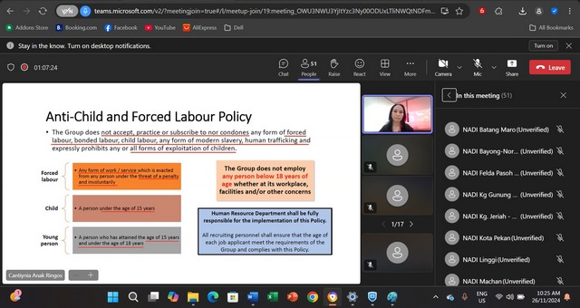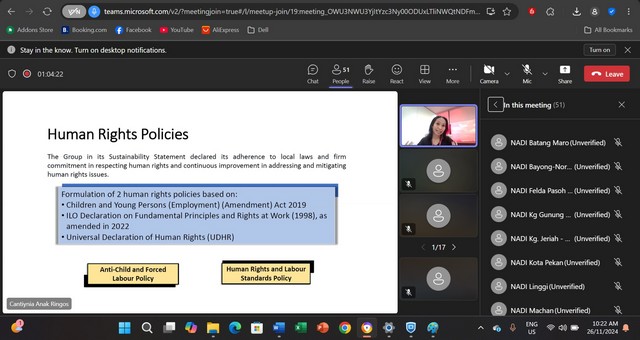 27 November 2024 | Aktiviti TerkiniPada 26 November 2024, telah berlangsungnya Staff Training 2024 bagi Pusat Sebaran Maklumat Nasional (NADI) yang tersenarai secara maya melalui aplikasi Microsoft Team. Pihak Sprintz Designs (SD) telah melantik seorang Trainer yang berpengalaman iaitu Mdm Cantiynia Anak Rigos untuk mengendalikan kursus pada kali ini. Tajuk kursus kali ini adalah Human Rights and Lobour Standards + Anti Child and Forced Labour.