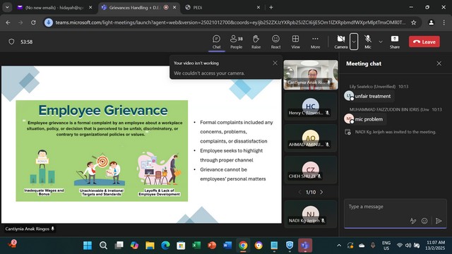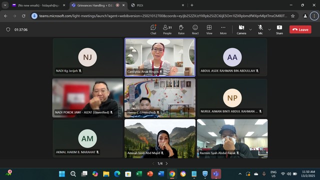 14 Februari 2025 | Aktiviti TerkiniPada 13 Februari 2025, telah berlangsungnya Staff Training 2025 bagi Pusat Sebaran Maklumat Nasional (NADI) yang tersenarai secara maya melalui aplikasi Microsoft Team. Pihak Sprintz Designs (SD) telah melantik seorang Trainer yang berpengalaman iaitu Puan Cantiynia Anak Ringos untuk mengendalikan kursus pada kali ini. Tajuk kursus kali ini adalah Grievance Handling + D.E.I Policy.