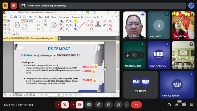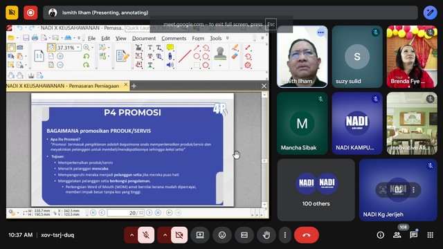 13 Jun 2025 | Aktiviti TerkiniPada 12 Jun 2025, Webinar Sesi 2 : Pemasaran dan Operasi Perniagaan telah diadakan di NADI Kg Jerijeh. Taklimat ini merujuk kepada satu program atau inisiatif yang bertujuan untuk memberi pendedahan kepada usahawan mikro dan PKS tentang kepentingan strategi pemasaran dalam era digital serta menyokong matlamat NADI Malaysia dalam memperkasakan ekonomi komuniti melalui pendidikan keusahawanan. Webinar ini berlangsung sekitar jam 10.00 pagi sehingga 11.30 pagi.