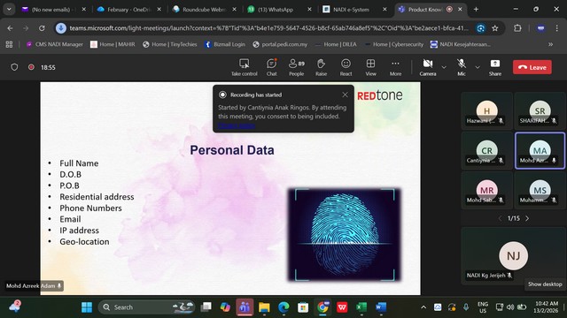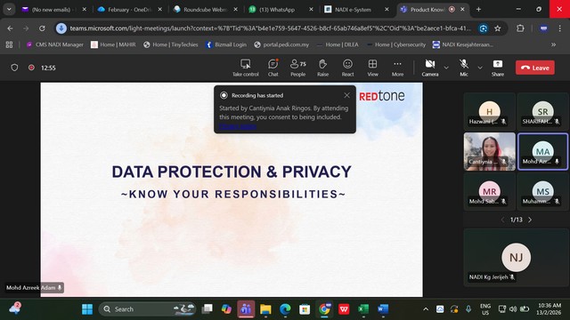 13 Februari 2026 | Aktiviti TerkiniPada 13 Februari 2026, telah berlangsungnya Staff Training 2026 bagi Pusat Sebaran Maklumat Nasional (NADI) yang tersenarai secara maya melalui aplikasi Microsoft Team. Pihak Sprintz Designs (SD) telah melantik seorang Trainer yang berpengalaman iaitu Encik Mohd Azreek Bin Adam untuk mengendalikan kursus pada kali ini. Tajuk kursus kali ini adalah Product Knowledge : Data Protection – Know Your Protection.